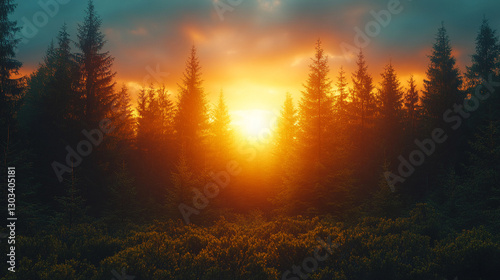 Naklejka premium Towering pine trees bathed in warm sunset sunlight symbolize resilience,...