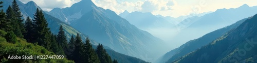 Fototapeta premium Towering pines blanket a rugged mountainside, mist swirling in valleys below...