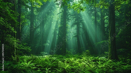 Obraz premium Towering redwood forests reaching for the sky, their ancient trunks cloaked in moss and ferns, shafts of sunlight filtering through the dense canopy, creating an ethereal atmosphere. Illustration,