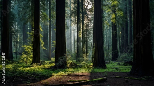 © stocksbyrs, Naklejka premium Towering redwoods in a mysterious forest.
