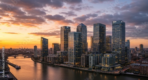 © Studio Stock Noerul, Fototapeta premium Towering skyscrapers line a river at sunset with dramatic clouds
