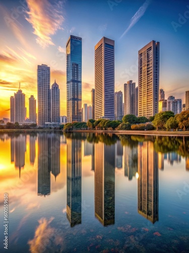 © Ningjing, Obraz premium Towering skyscrapers reflected in a calm urban lake at sunset