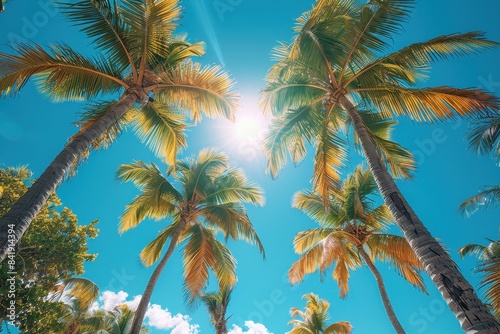 Naklejka premium Towering sunlit palm trees on a tropical beach, symbolizing paradise.