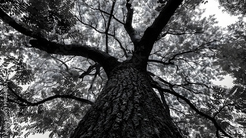 Naklejka premium Towering Tree Canopy Reaching for the Sky Lush Green Foliage and Intricate...