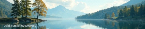 Fototapeta premium Towering trees on isolated shores of a serene lake, landscape, peaceful,...