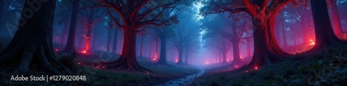 Obraz premium Towering trees radiating an otherworldly glow, casting shadows on the ground,...