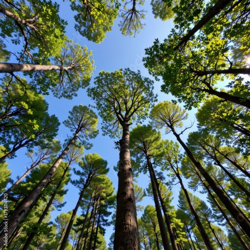 © OnuTH, Fototapeta premium Towering Trees Reaching Towards a Clear Blue Sky in a Lush Green Forest
