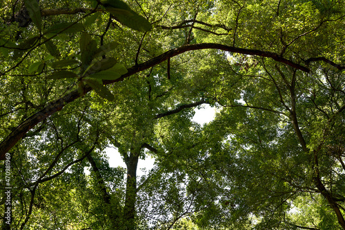 Fototapeta premium Towering trees with green leaves in the forest