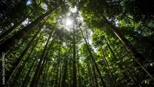 © MURSHIDUR RAHMAN, Obraz premium Towering Tropical Trees Bathed in Sunlight A Lush Canopy Perspective for Nature and Environmental Conservation Concepts