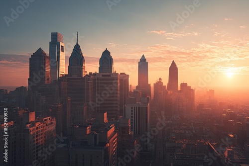 © Sulastri, Fototapeta premium Towering urban structures reflect golden sunrise hues over a dense city skyline