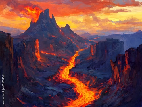 © Bos Amico, Fototapeta premium Towering volcanic peaks and jagged rock formations carved by tectonic forces with rivers of glowing lava carving through the desolate and untamed natural landscape
