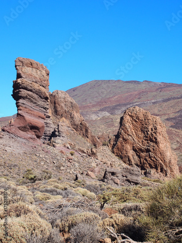 Fototapeta premium towering volcanic rock formations and landscape with mountains in teide...
