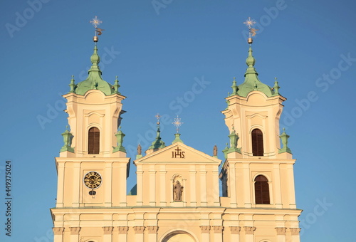 © allegro60, Fototapeta premium Towers of an ancient gothic catholic basilica on a blue sky background
