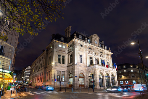 © Leonid Andronov, Naklejka premium Town Hall of the 18th arrondissement in Paris, France. The historic building with a clock tower and flags stands on Place Jules Joffrin at night