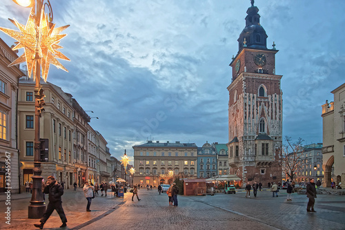 © Roman Babakin, Naklejka premium Town Hall Tower and the street market in the Main Market Square of the Old City in Krakow in Poland at Christmas