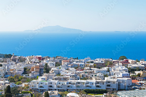 Naklejka premium Town of Capri, Italy with white houses, blue sky and blue water. View of...