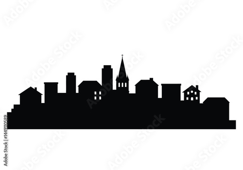 © CreativeDesign, Naklejka premium Town silhouette. This image shows a town silhouette with various buildings, including houses, a church, and other structures, representing a cityscape or urban skyline. clipart illustration design.