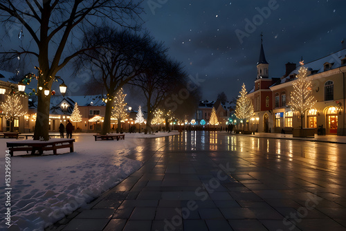 Obraz premium Town square decorated with Christmas lights and ornaments, evening sky, snow...