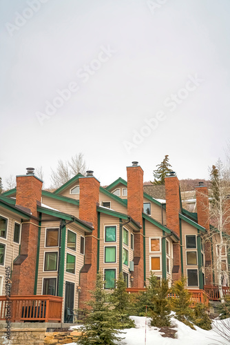 © Jason, Naklejka premium Townhomes exterior with porches and brick chimneys against cloudy sky in winter