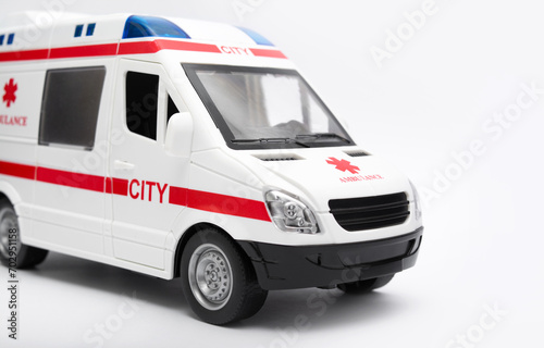 © Юлия Ромашко, Naklejka premium Toy ambulance on a white background. Healthcare concept