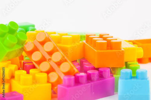 © wandee007, Obraz premium Toy building colorful blocks on white paper background