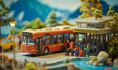 Obraz premium Toy bus stop with miniature people and luggage.