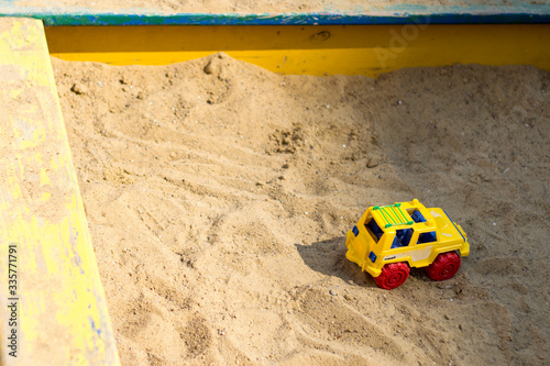 © Виталий Стамат, Obraz premium Toy car in the sandbox. Quarantine. Children stayed at home.