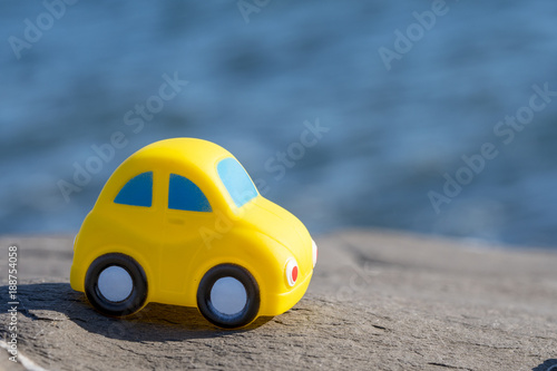 © Arcansél, Naklejka premium Toy Car near the sea. Travel, tourism, holiday and adventure concept.