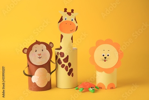 © New Africa, Fototapeta premium Toy monkey, giraffe and lion made from toilet paper hubs with plasticine turtle on yellow background. Children's handmade ideas