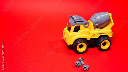 © Zarina Lukash, Obraz premium Toy on a red background. A boy's car with a place for text for a toy store. Disassembled typewriter on screws with screwdriver