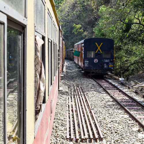 © rahul, Fototapeta premium Toy Train moving on mountain slopes, beautiful view, one side mountain, one side valley moving on railway to the hill, among green natural forest. Toy train from Kalka to Shimla in India, Indian Train