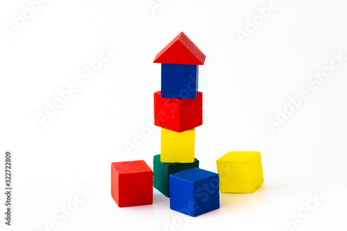 Fototapeta premium Toy wooden building blocks on white background
