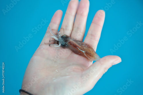 Obraz premium Toyama,Japan - April 6, 2024: Closeup of firefly squid or toyama squid or Luminescent dwarf squid or Sparkling Enope Squid