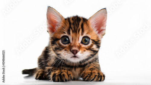 © Sonya, Obraz premium Toyger Kitten Lying on White Background.