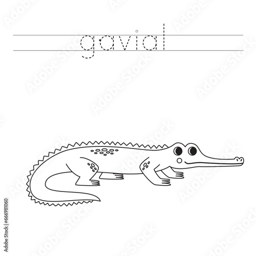 Fototapeta premium Trace the letters and color cartoon gavial. Handwriting practice for kids.