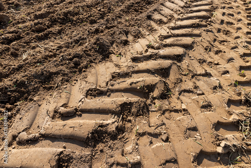 Fototapeta premium traces of a tractor on the soil during tillage, soil in a field with traces...