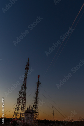 © Petko, Fototapeta premium Traces of airplanes in the sky on a summer night.