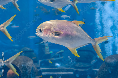 Naklejka premium Trachinotus blochii or snubnose pompano in Atlantis, Sanya, Hainan, China.....