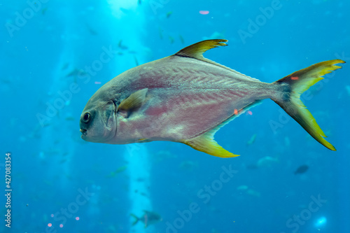 © Evgeniy, Naklejka premium Trachinotus blochii or snubnose pompano in Atlantis, Sanya, Hainan, China.. Pompanos are marine fishes in the genus Trachinotus in the family Carangidae (better known as "jacks").