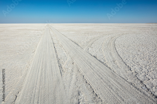 Naklejka premium Tracks of cars in the salt dust of the Makgadikgadi salt-pan in Botswana