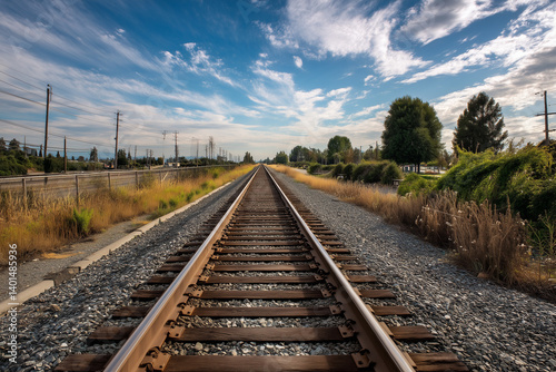 © NTGUILTY, Fototapeta premium Tracks stretch under a vibrant blue sky towards distant trees on a sunny afternoon