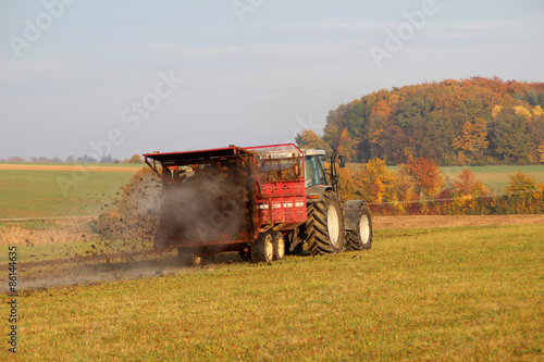 © leomalsam, Naklejka premium Tractor at work. Tractor spread manure.