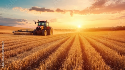 © Imron, Fototapeta premium Tractor baling wheat field at sunset