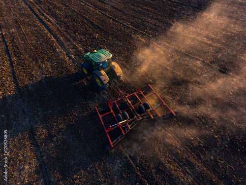 © ValentinValkov, Naklejka premium Tractor cultivating field at autumn