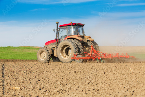 Obraz premium Tractor cultivating field at spring
