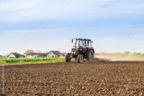 Obraz premium Tractor cultivating field at spring