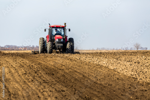 Obraz premium Tractor cultivating field at spring