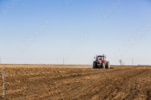 Obraz premium Tractor cultivating field at spring
