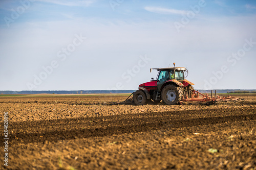 Obraz premium Tractor cultivating field at spring