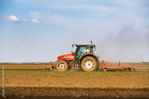 Obraz premium Tractor cultivating field at spring